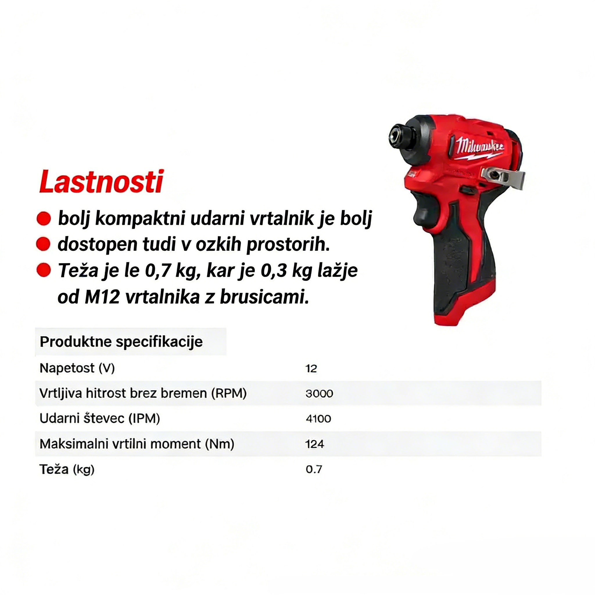 2. Tehta le 0,7 kg, kar je 0,3 kg manj kot vrtalnik M12.